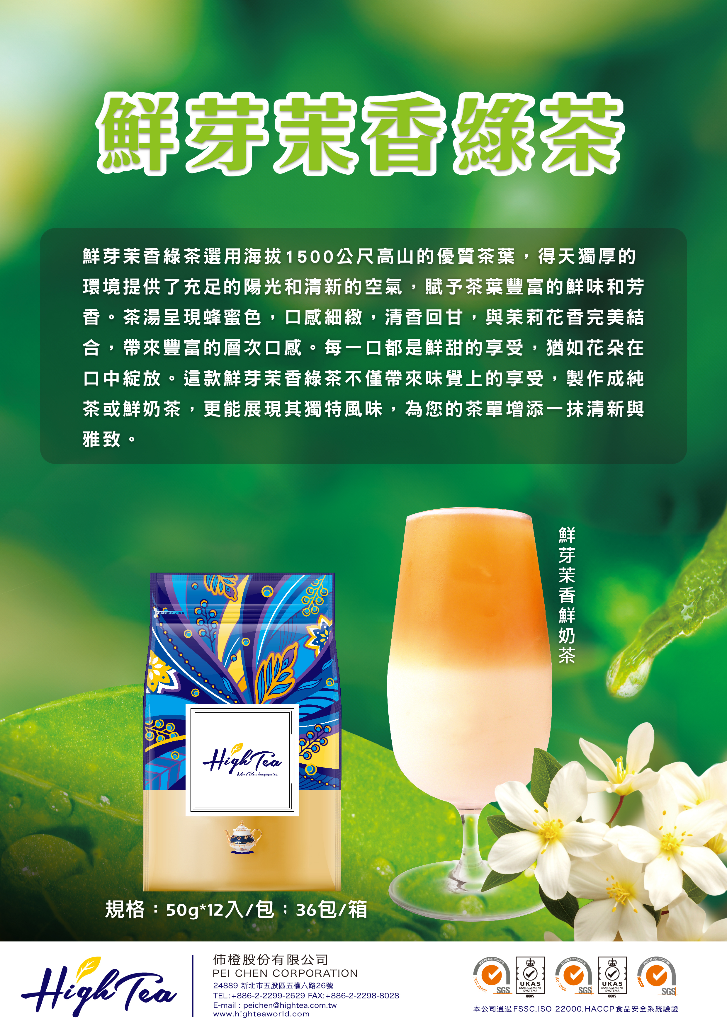 鮮芽茉香綠茶選用海拔1500公尺高山的優質茶葉,得天獨厚的環境提供了充足的陽光和清新的空氣,賦予茶葉豐富的鮮味和芳香。茶湯呈現蜂蜜色,口感細緻,清香回甘,與茉莉花香完美結合,帶來豐富的層次口感。每一口都是鮮甜的享受,猶如花朵在口中綻放。這款鮮芽茉香綠茶不僅帶來味覺上的享受,製作成純茶或鮮奶茶,更能展現其獨特風味,為您的茶單增添一抹清新與雅致。