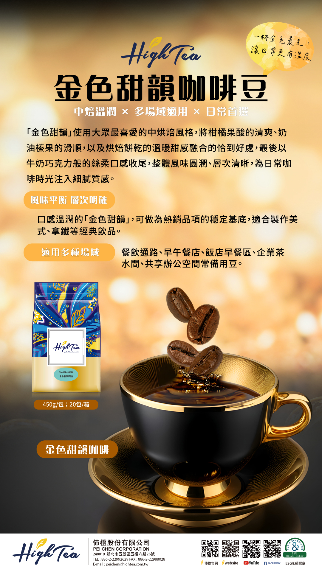 一杯金色晨光,讓日常更有溫度。「金色甜韻」融合柑橘酸香、奶油榛果的滑順,帶出烘焙餅乾與牛奶巧克力般的溫暖尾韻,風味圓潤、層次分明。【如需諮詢,請點選LINE@或是聯絡我們並留下基本資料】