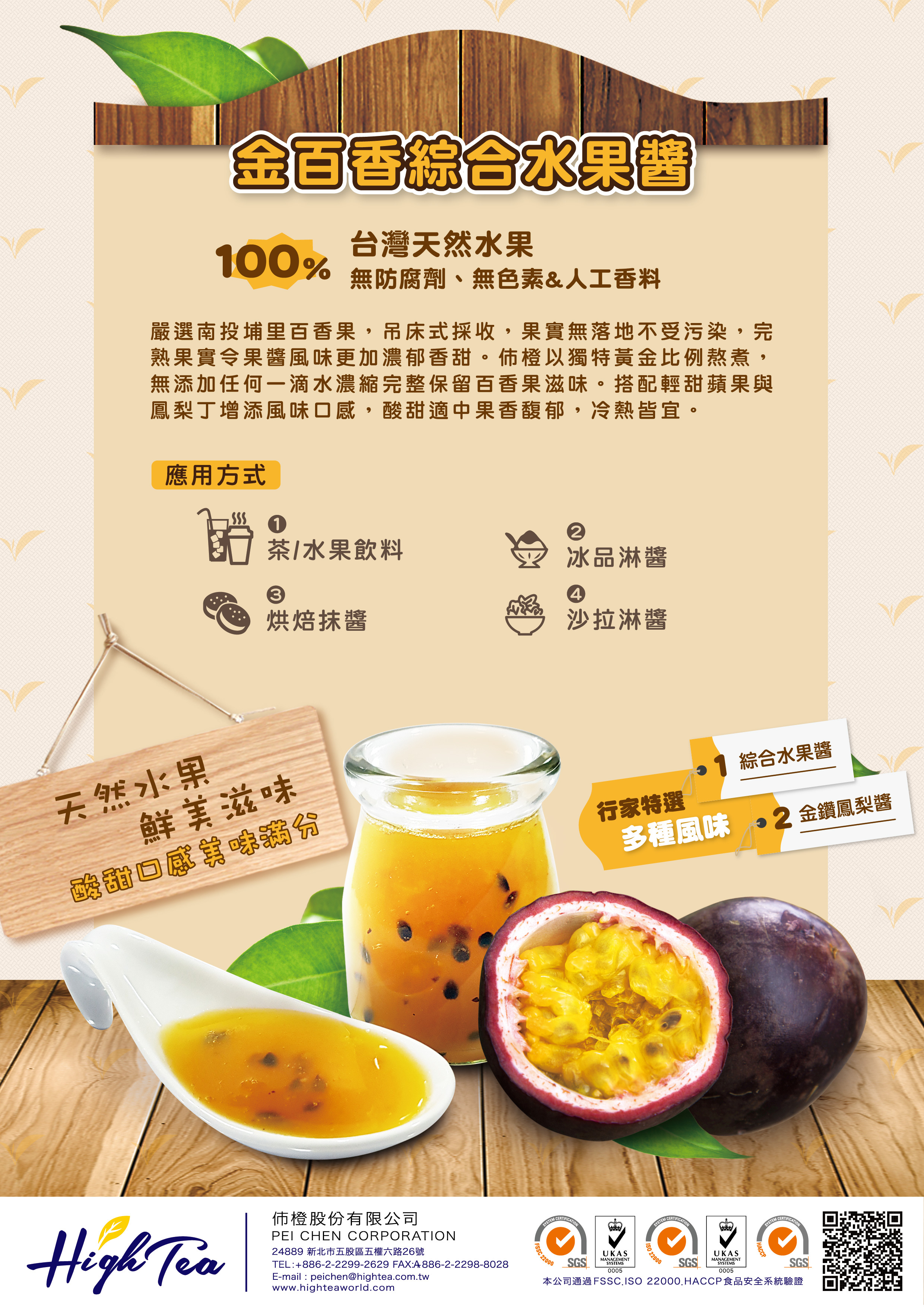 濃厚的百香果滋味,含有增添口感的鳳梨丁,可搭配各式茶品做成特色水果茶,不添加防腐劑、人工香料及色素【如需諮詢,請點選LINE@或是聯絡我們並留下基本資料】