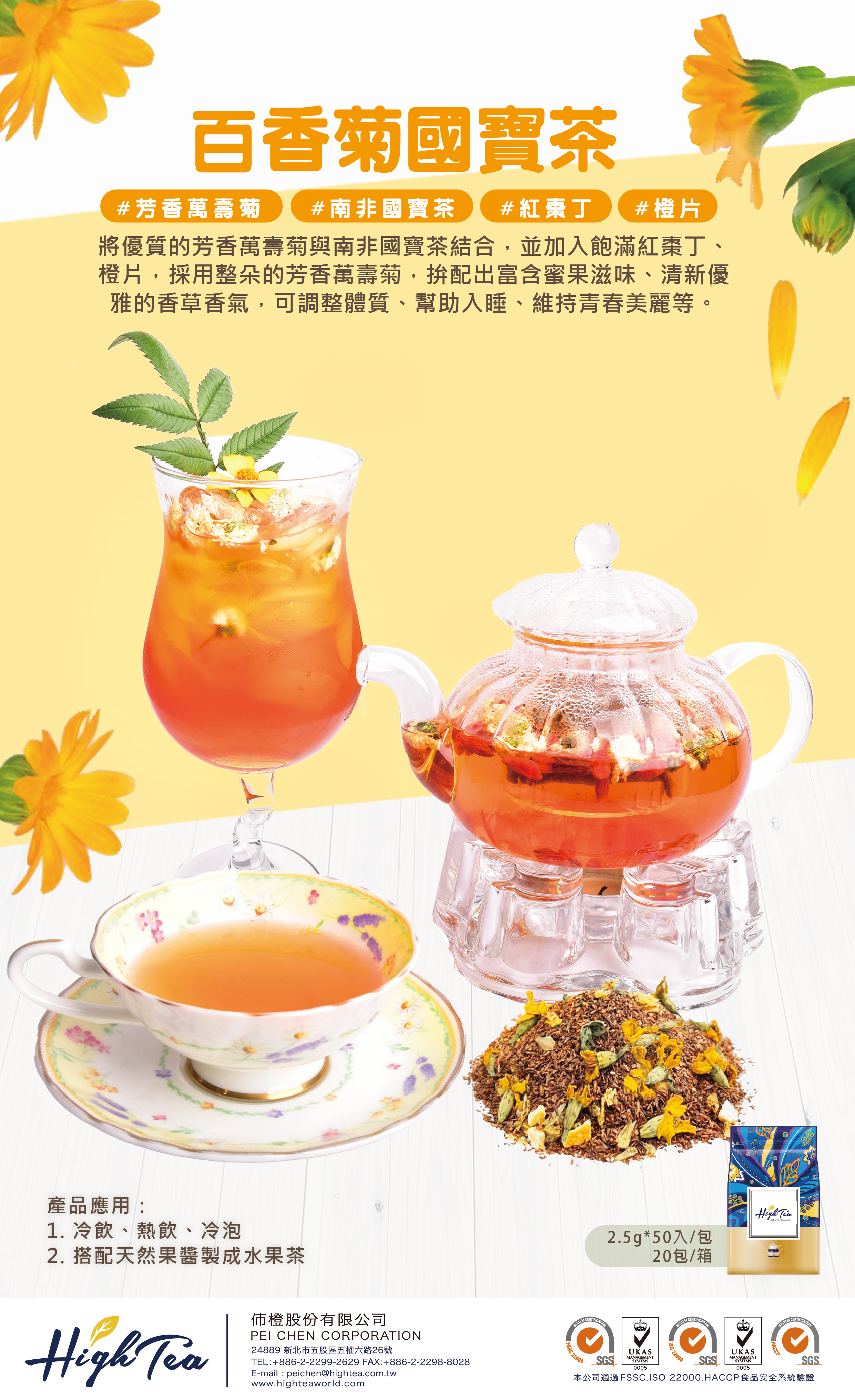 百香菊博士茶將優質的芳香萬壽菊與南非國寶茶結合,並加入飽滿紅棗丁、橙片,採用整朵的芳香萬壽菊,拚配出富含蜜果滋味、清新優雅的香草香氣,可調整體質、幫助入睡、維持青春美麗等。【如需諮詢,請點選LINE@或是聯絡我們並留下基本資料】
