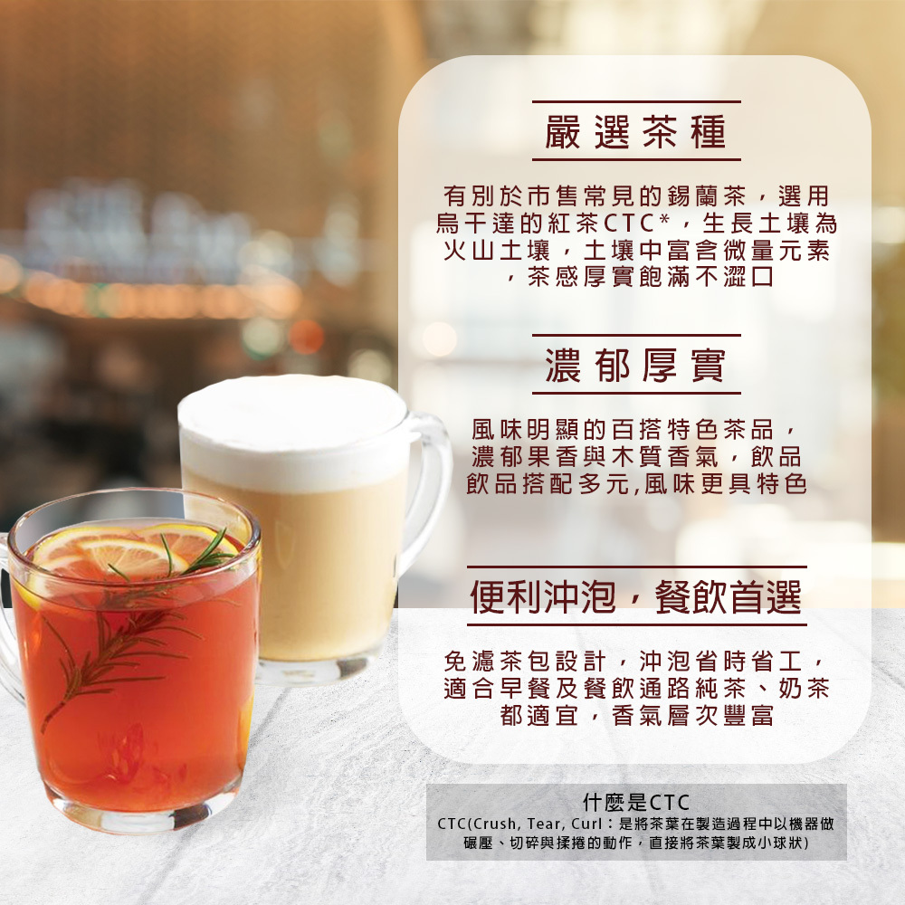 有別於市售常見的錫蘭茶,選用烏干達的CTC(Crush, Tear, Curl:是將茶葉在製造過程中以機器做碾壓、切碎與揉捲的動作,直接將茶葉製成小球狀),生長土壤為火山土壤,土壤中富含微量元素,茶葉茶感濃郁【如需諮詢,請點選LINE@或是聯絡我們並留下基本資料】