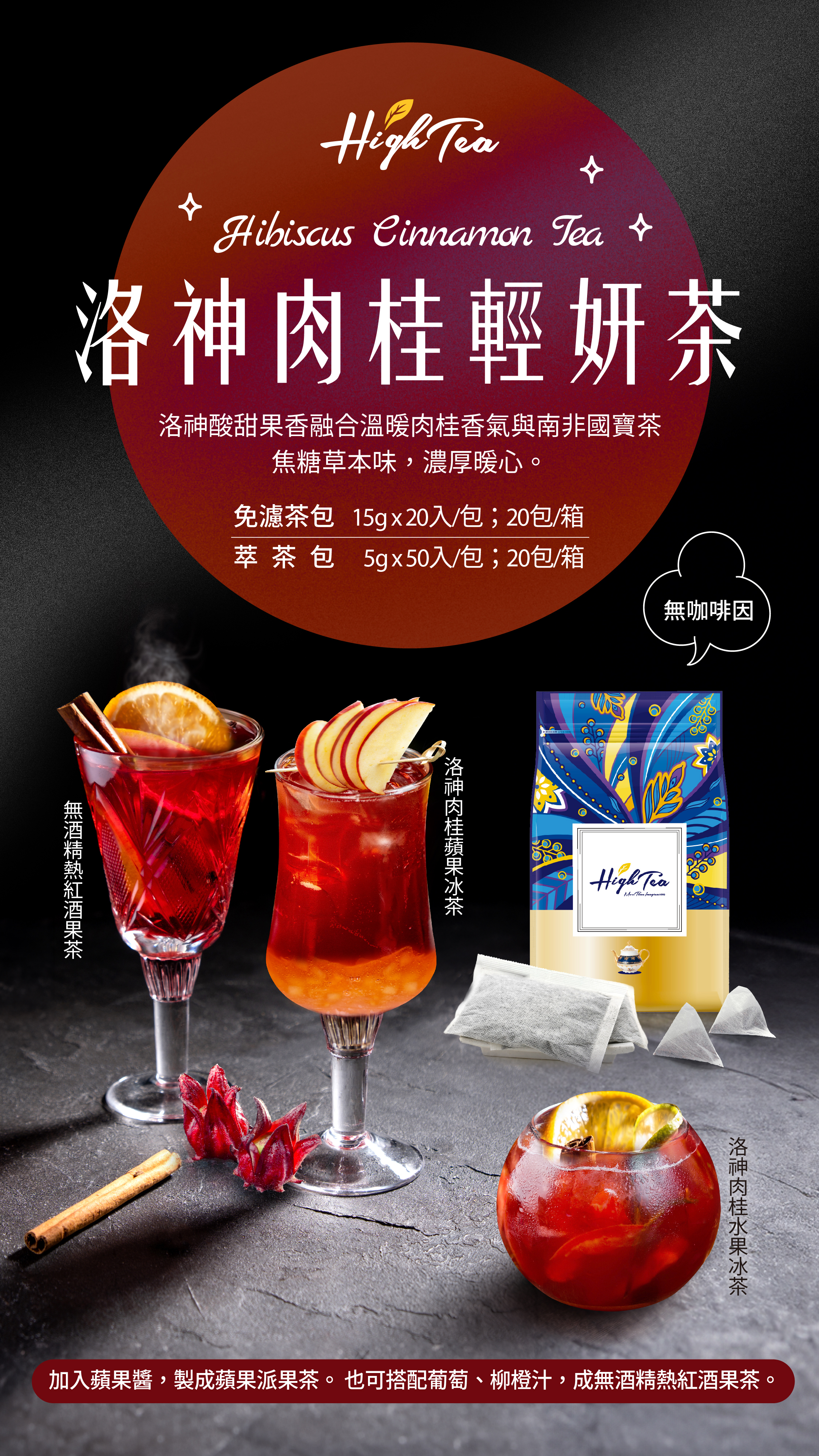 洛神的酸甜果香融合溫暖的肉桂香氣,和南非國寶茶的焦糖草本味,無咖啡因,令人感到濃厚暖心的風味。