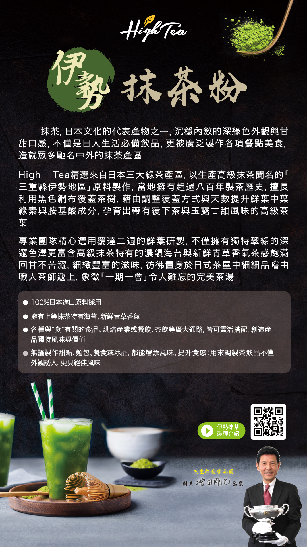 精選來自日本高級抹茶原料產地之一的三重縣 伊勢地區的抹茶,擁有獨特的翠綠深邃色澤,更富含高級抹茶特有的濃韻海苔與新鮮青草香氣,茶感飽滿、回甘不苦澀【如需諮詢,請點選LINE@或是聯絡我們並留下基本資料】