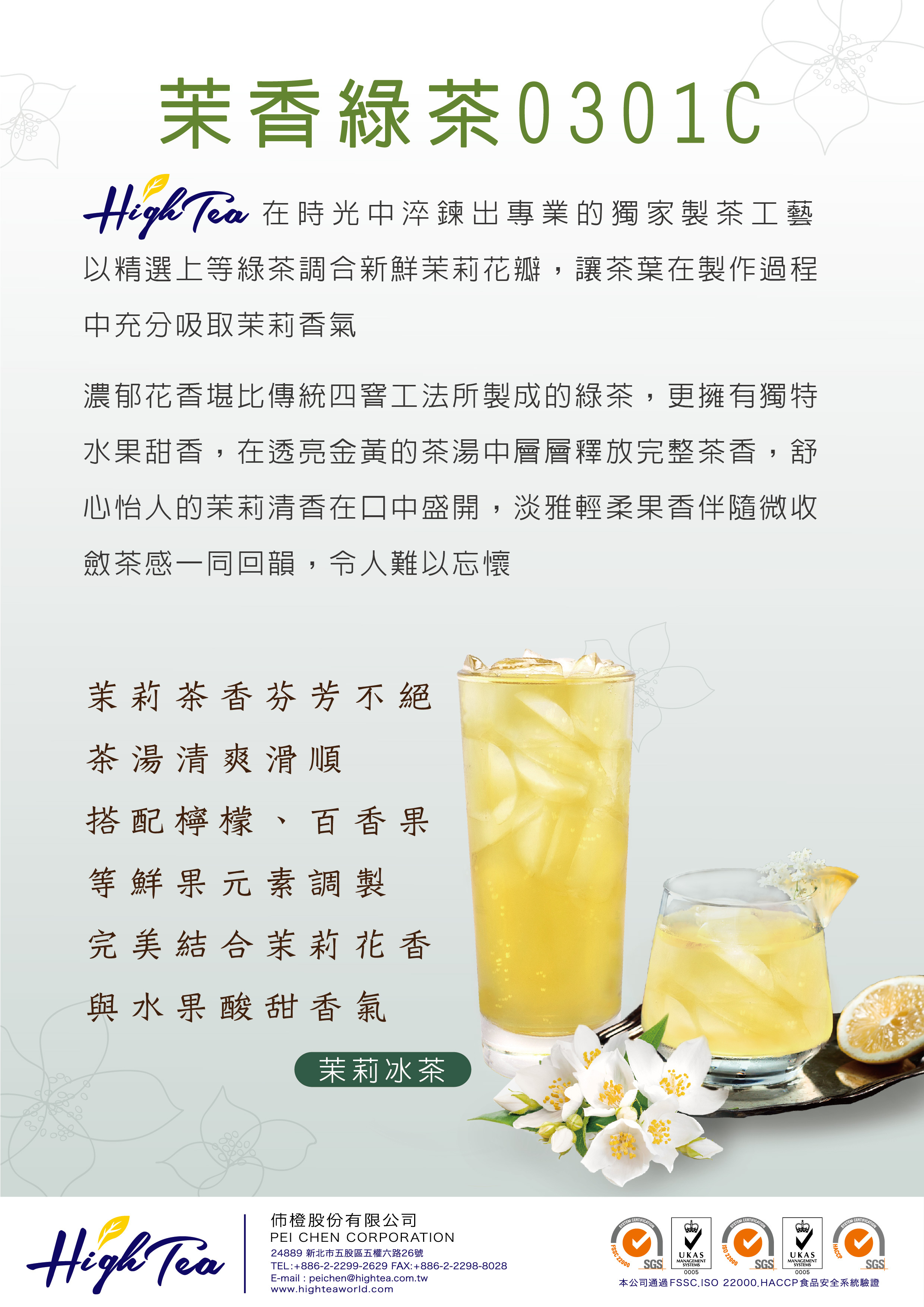 精選上等綠茶調合新鮮茉莉花瓣,讓茶葉在製作過程中充分吸取茉莉香氣 濃郁花香堪比傳統四窨工法所製成的綠茶,更擁有獨特水果甜香,在透亮金黃的茶湯中層層釋放完整茶香,舒心怡人的茉莉清香在口中盛開。淡雅輕柔果香伴隨微收斂茶感一同回韻,令人難以忘懷【如需諮詢,請點選LINE@或是聯絡我們並留下基本資料】